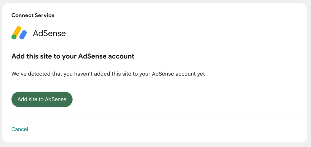 This message displays if your site has not been added to your AdSense account. You can add the site to your AdSense account by clicking the Add site to AdSense button. Clicking the button will direct you to the AdSense platform, where you will need to follow the provided instructions in order to add the site.