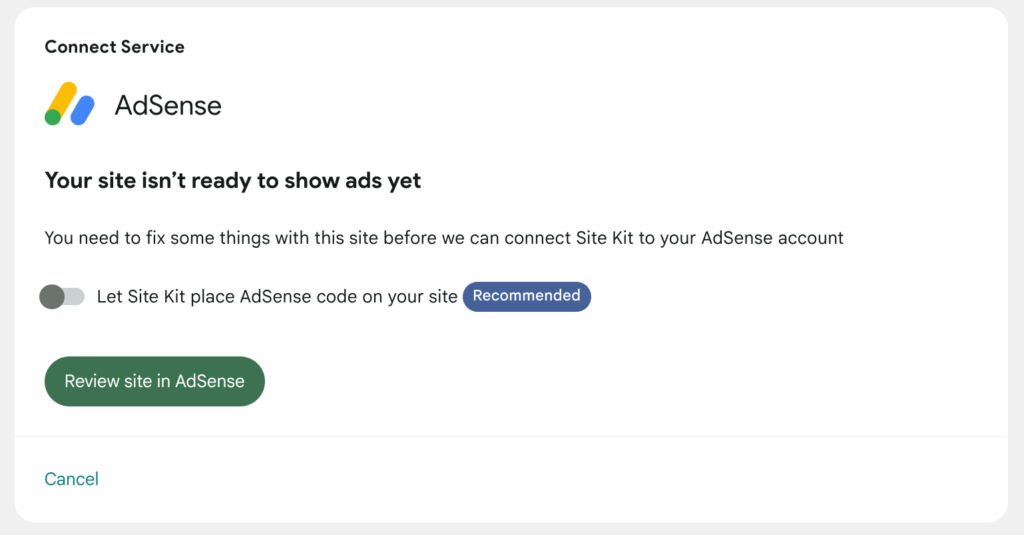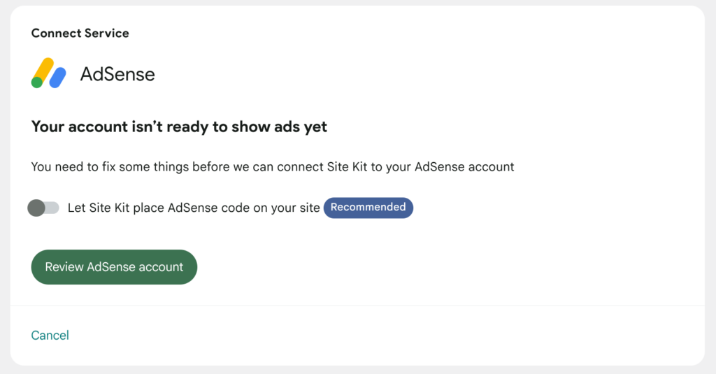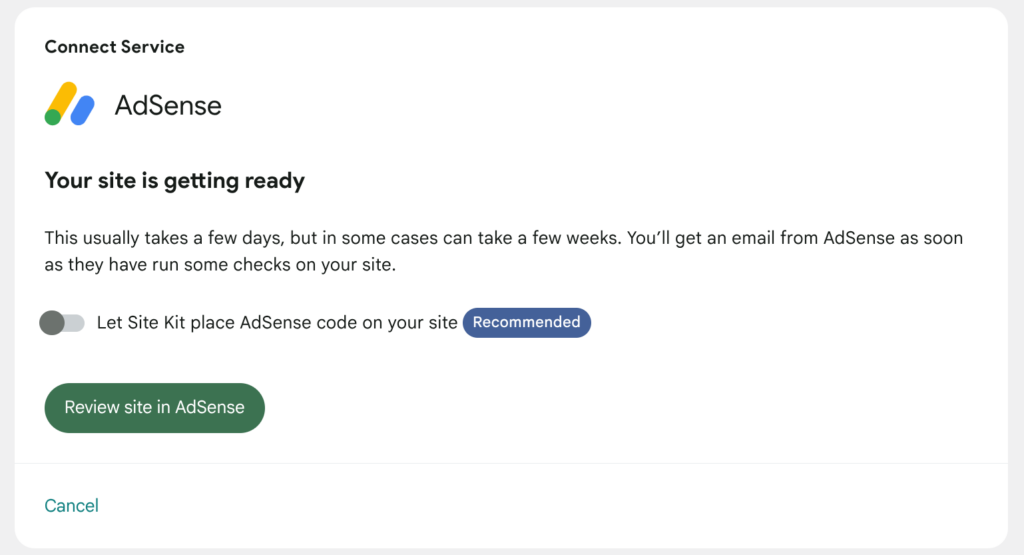 It can take a day up to a few weeks for your account to be reviewed. Your site status will appear as “Getting ready” until that time, and the AdSense module within Site Kit will not be fully connected.
