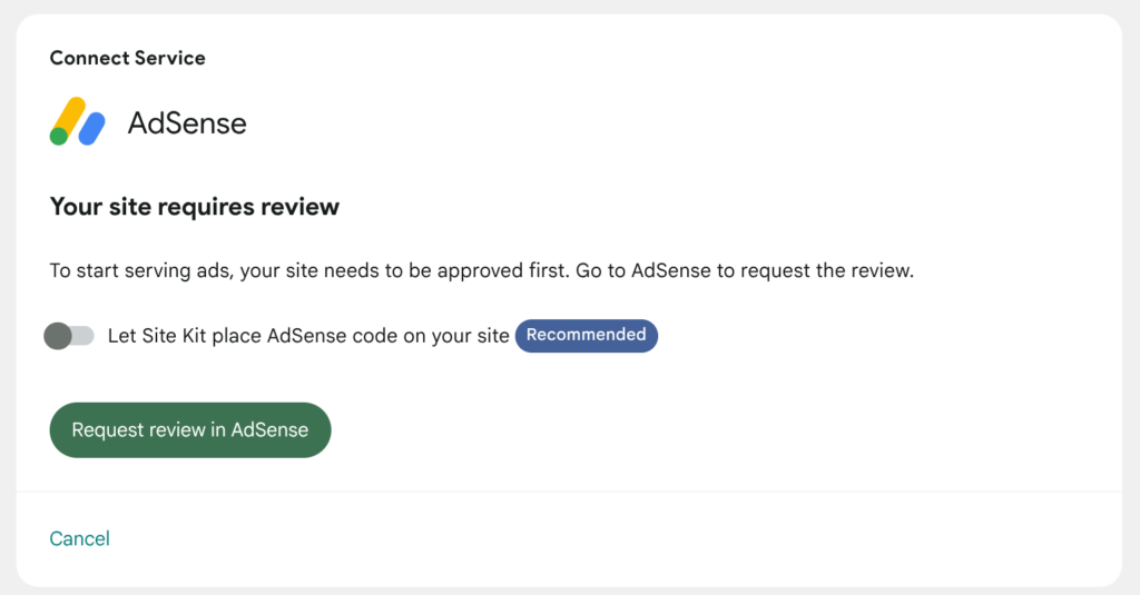 This message displays when your site has not yet been approved to display ads by the AdSense team. Clicking on the Request Review in AdSense will direct you to the AdSense platform, where you will need to follow the provided instructions in order to request a review.