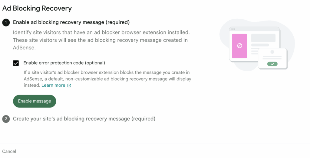 On step two, you will be prompted to create a custom ad blocking recovery message, which is required for the feature. To add a message, click on the Create message button.