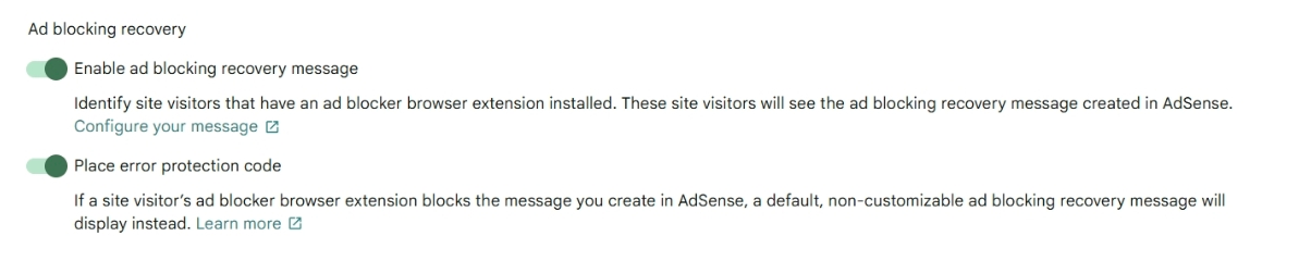 Note that if you have previously set up ad blocking recovery and manually placed the required code snippet on your site, you will see a message noting this in the AdSense settings. We recommend that you remove the previously placed code snippet and instead use Site Kit to place the code snippet.