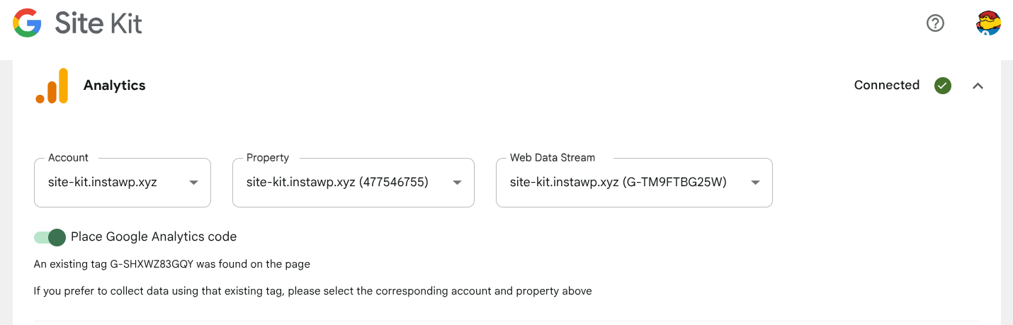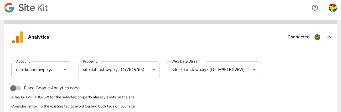 When this occurs, Site Kit will automatically set the Place Google Analytics code toggle to off to avoid duplication. If you wish to remove the tag as inserted elsewhere, you can do so and later ask Site Kit to insert the tag instead by going to Site Kit > Settings > Connected Services > Analytics > Edit > Place Google Analytics code.
