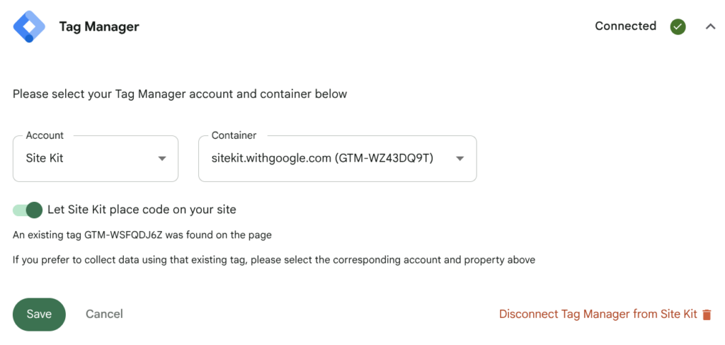 You can choose to select the existing account and container if you wish. If selected, Site Kit will set the Let Site Kit place code on your site toggle to off to ensure that a duplicate Google Tag Manager snippet is not placed. Alternatively, you can select a different account and container that is associated with your Google Tag Manager account. Site Kit will then insert this container code snippet on your site as long as you’ve set the Let Site Kit place code on your site toggle to on.